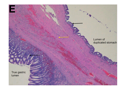 令人驚訝的是,胃大部切除標本(圖D)檢查發(fā)現(xiàn)在疑似腫瘤的胃壁區(qū)域內(nèi)有扁平囊。這一扁平囊可以拉伸到9×8×4.5cm。胃囊與真實胃腔之間有一處共同的壁。通過此壁的組織學切片(圖E)顯示了分隔壁兩側(cè)的平滑肌細胞層和胃黏膜。這排除了GIST,證實胃重復畸形的診斷(GDC)。胃重復畸形是一種罕見的先天性異常,僅占胃腸道所有重復囊腫的4%至9%。大多數(shù)病例報告發(fā)生在兒童中且位于胃大彎處。GDC有以下3個特點:(1)囊腫的壁與胃壁相連,(2)囊腫由平滑肌包圍,通過肌肉與胃壁相連,(3)囊壁排列有胃上皮或其它類型的胃黏膜。