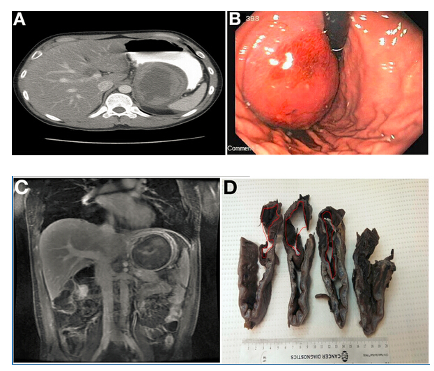 腹部計算機斷層掃描(CT)顯示胃底有一9.8×7.4cm不均質(zhì)腫塊(圖A),在隨后的胃鏡檢查中也發(fā)現(xiàn)該腫塊(圖B)。