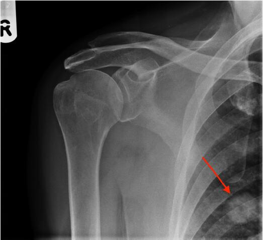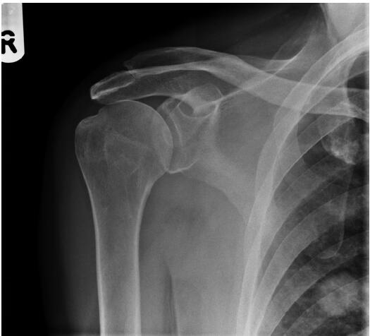 患者,男性,62歲,跌倒后,肩膀越來(lái)越疼。全科醫(yī)生要求該患者進(jìn)行放射檢查(圖1)。