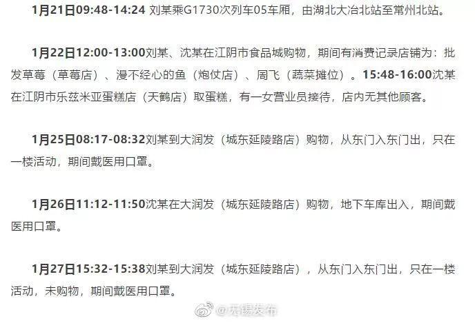 無錫江陰新型冠狀病毒感染的肺炎確診病例2劉某、病例3沈某(為病例2的兒媳),目前兩人均在市定點醫(yī)院隔離治療,病情穩(wěn)定 。在流行病學(xué)調(diào)查時,發(fā)現(xiàn)劉某、沈某有以下出入公共場所活動軌跡,現(xiàn)緊急尋找相關(guān)接觸人員。