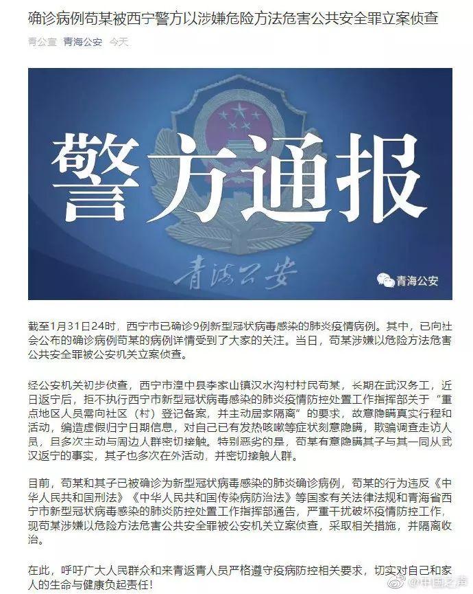 經(jīng)公安機關(guān)初步偵查,西寧市湟中縣李家山鎮(zhèn)漢水溝村村民茍某,長期在武漢務(wù)工,近日返寧后,拒不執(zhí)行西寧市新型冠狀病毒感染的肺炎疫情防控處置工作指揮部關(guān)于“重點地區(qū)人員須向社區(qū)(村)登記備案,并主動居家隔離”的要求,故意隱瞞真實行程和活動,編造虛假歸寧日期信息,對自己已有發(fā)熱咳嗽等癥狀刻意隱瞞,欺騙調(diào)查走訪人員,且多次主動與周邊人群密切接觸。