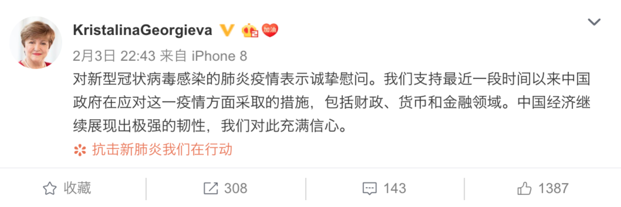 國(guó)際貨幣基金組織(IMF)總裁克里斯塔利娜·格奧爾基耶娃3日在社交媒體發(fā)文稱,IMF支持最近一段時(shí)間以來(lái)中國(guó)政府在應(yīng)對(duì)疫情方面采取的措施,包括財(cái)政、貨幣和金融領(lǐng)域。她說(shuō):“中國(guó)經(jīng)濟(jì)繼續(xù)展現(xiàn)出極強(qiáng)的韌性,我們對(duì)此充滿信心?!?日,格奧爾基耶娃還在社交媒體上傳了一段視頻,用中文說(shuō):“中國(guó)加油!武漢加油!”