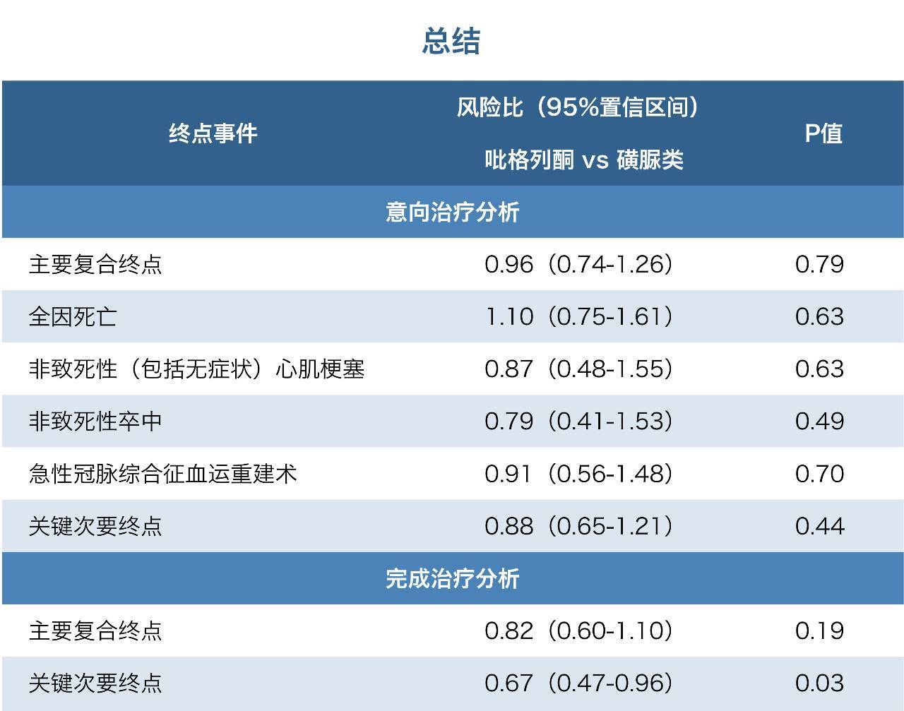 但是在實(shí)際處理分析(on-treatment analysis,統(tǒng)計(jì)實(shí)際服用研究藥物中及停藥30天后的終點(diǎn)事件)中,吡格列酮組發(fā)生次要終點(diǎn)事件的風(fēng)險(xiǎn)顯著低于磺脲類組(HR 0.57,95%CI0.47-0.96,p=0.03)。