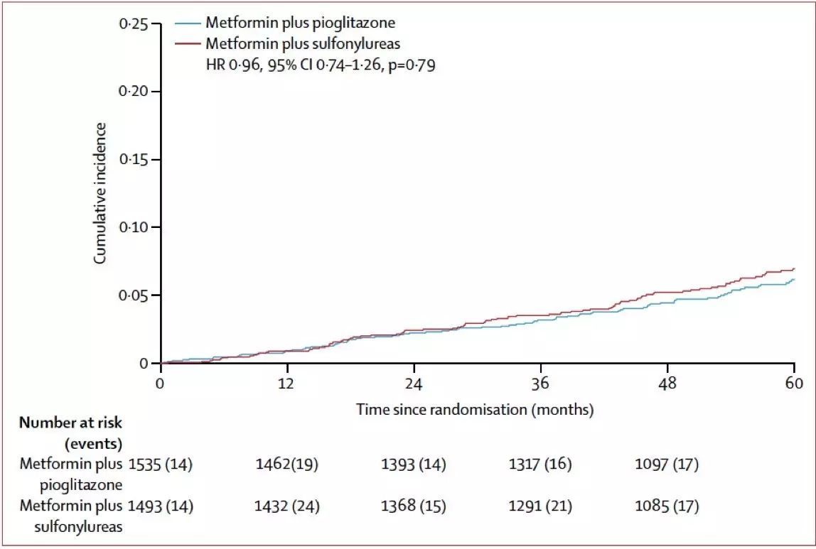 近5年隨訪中,兩組在主要終點(diǎn)(心血管疾病復(fù)合終點(diǎn),包括全因死亡、非致死性心肌梗死、非致死性卒中、緊急冠脈再血管化)上無統(tǒng)計(jì)學(xué)差異(吡格列酮組 Vs 磺脲類組:HR 0.96,95%CI 0.74-1.26,p=0.79)。