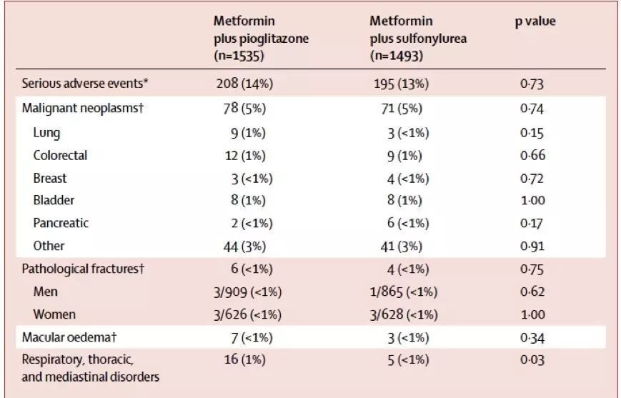 3二者骨折和腫瘤發(fā)生率(包括膀胱癌在內(nèi))無明顯差別。吡格列酮心衰事件發(fā)生率更高,但二者的差異不具有統(tǒng)計(jì)學(xué)意義。