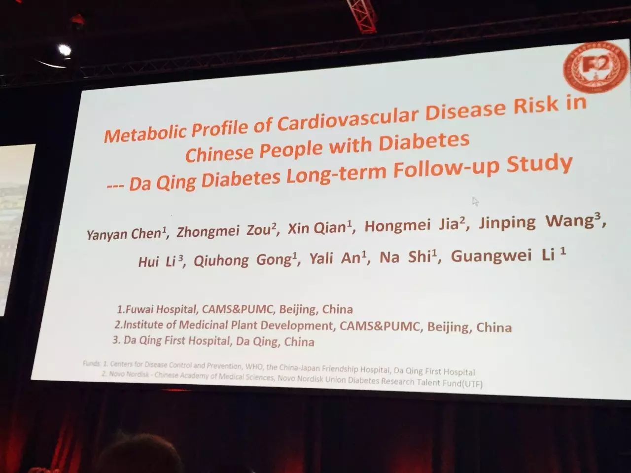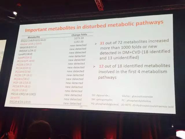 里斯本時間9月14日上午,在Fitzgerald Hall,中國醫(yī)學(xué)科學(xué)院阜外醫(yī)院陳燕燕教授代表團(tuán)隊匯報了“中國糖尿病人群心血管疾病風(fēng)險代謝特征——大慶研究長期隨訪結(jié)果”。通過對大慶研究人群進(jìn)行長期隨訪,發(fā)現(xiàn)72種代謝產(chǎn)物及8種代謝途徑與糖尿病心血管疾病相關(guān),其中18種代謝產(chǎn)物在糖尿病合并心血管疾病人群中升高超過1000倍。多變量回歸分析顯示2種代謝物(20-HETE、Palmitoyl sphingomyelin)可能是糖尿病合并心血管疾病的獨立危險因素;其中4種代謝途徑與糖尿病心血管疾病高度相關(guān)。